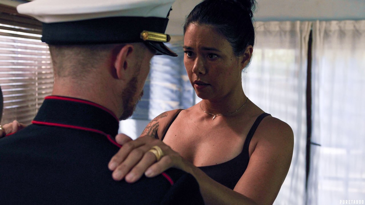 Asian stepmom Dana Vespoli rides white stepson Oliver Flynn cowgirl, spreading nude for family taboo photos; MILF feet, short hair, interracial mom-son heat.
