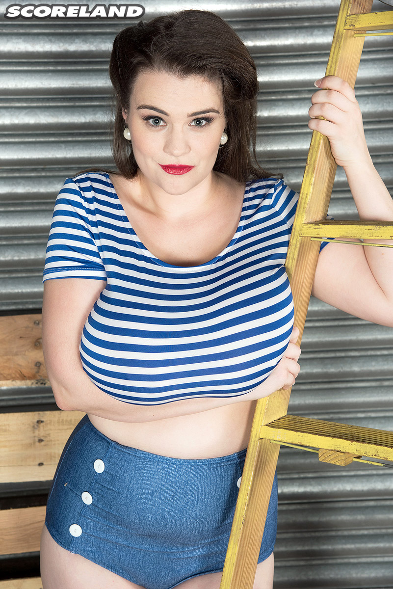 Busty brunette Tiggle Bitties climbs a ladder, teasing with her huge natural saggy tits, stripping clothes to flash big nipples and curvy ass in hot solo.