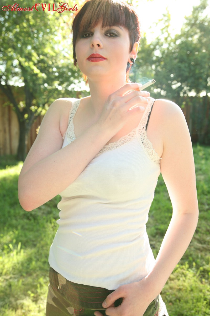 Smoking Short Haired Girl Morna Flashes Tits And Twat In Backyard - Gallery Information