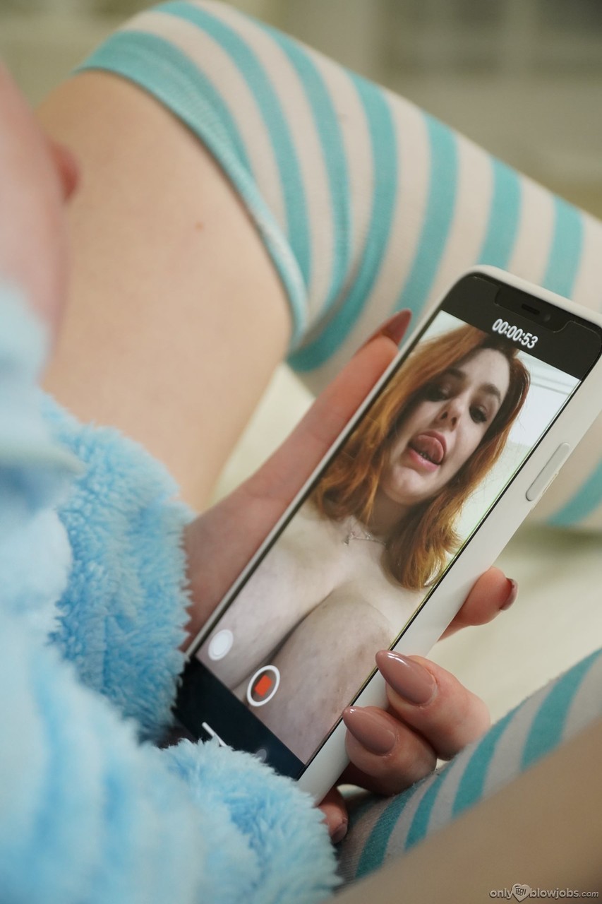 Busty redhead Annabel Redd flaunts natural big tits and delivers a steamy blowjob in this amateur teen selfie, climaxing with a hot cumshot.