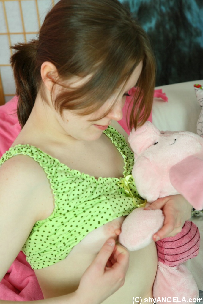 Sweet Young Girl Angela Uncovers Tiny Tits While Playing Plush Toy