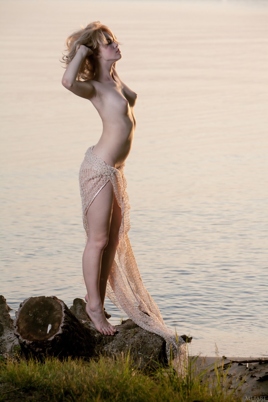 Alisa G strips nude on a sun-drenched beach, flaunting skinny legs, perfect blonde pussy and teen glamour in hot naked solo art pics for American nudist fans.