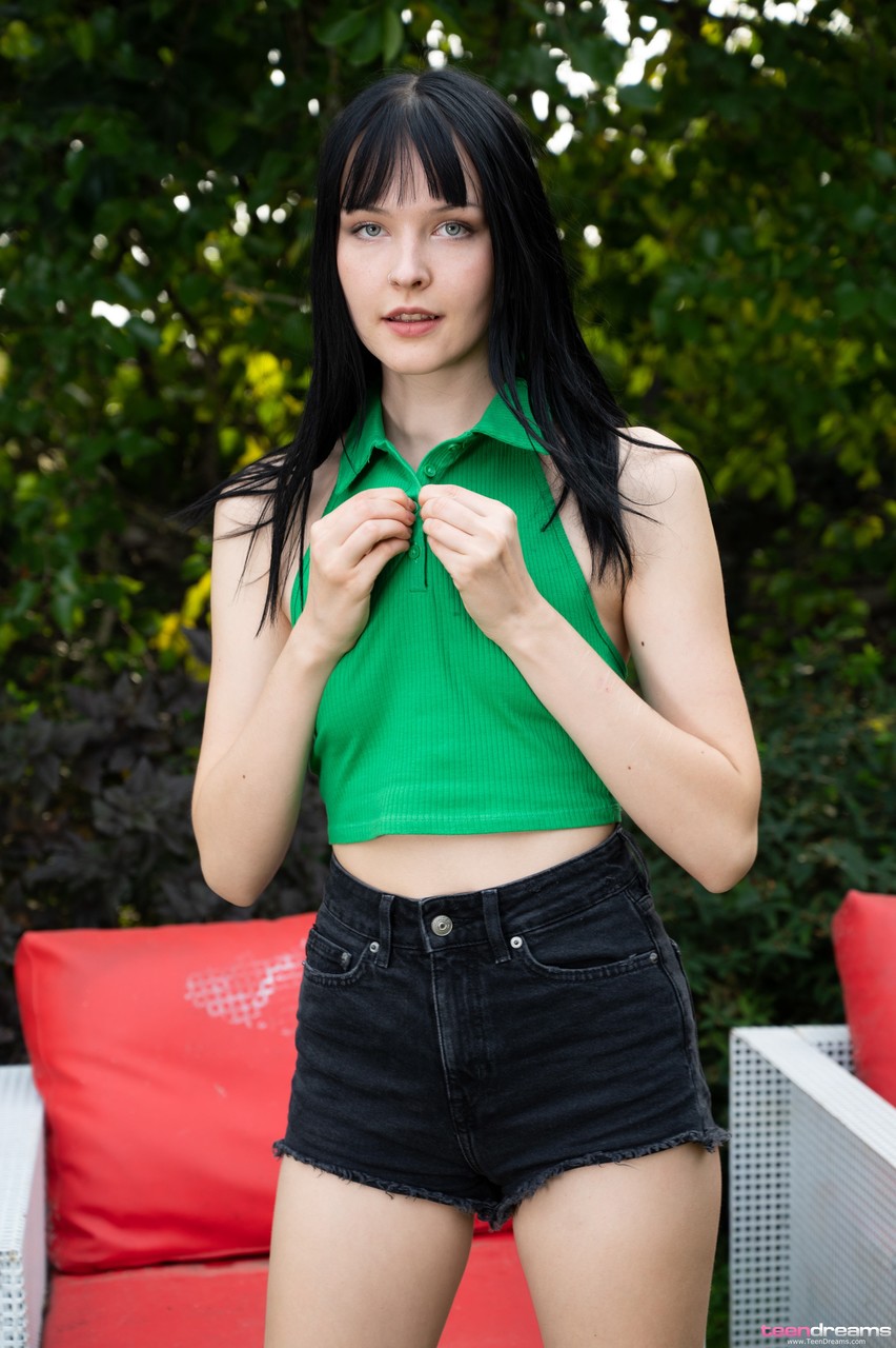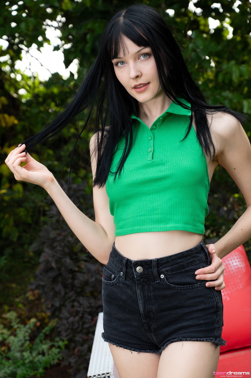 Amelia Riven fulfills teen dreams in hot outdoor pics: cute brunette spreads tight pussy in tiny shorts and panties, teasing solo non-nude to full open shots.