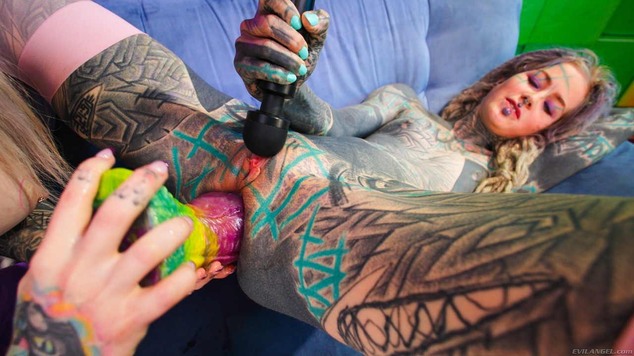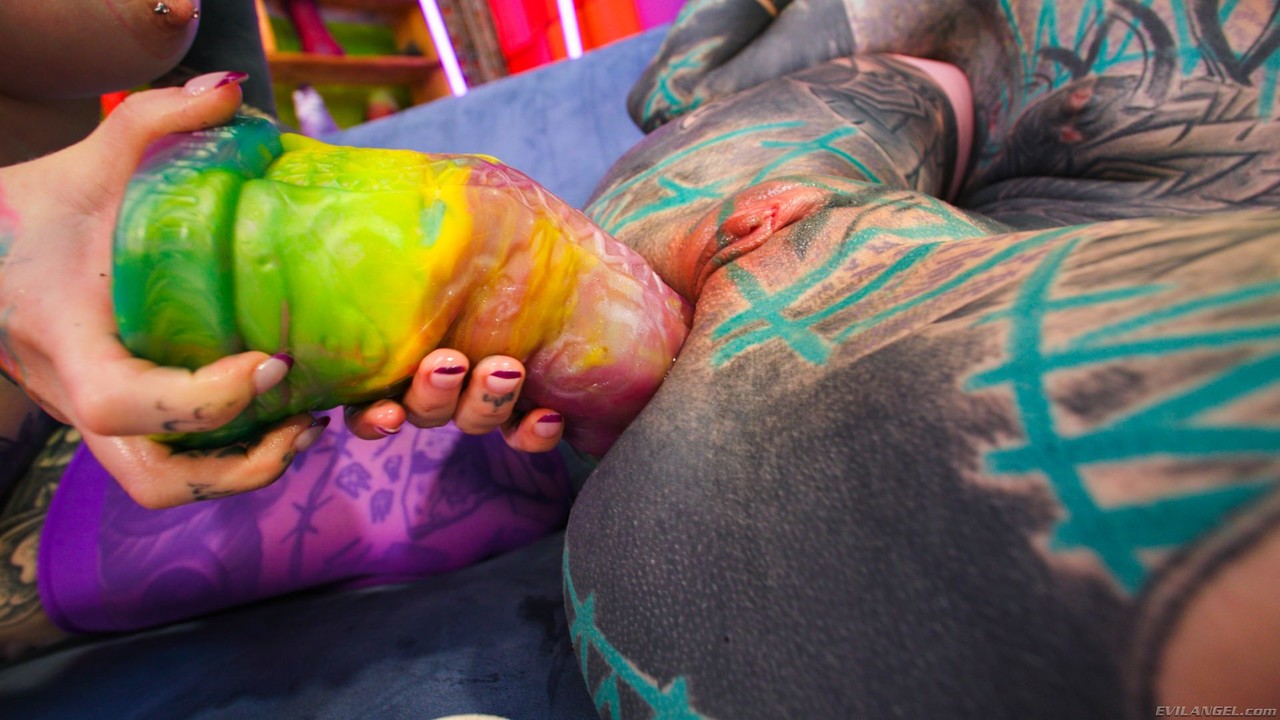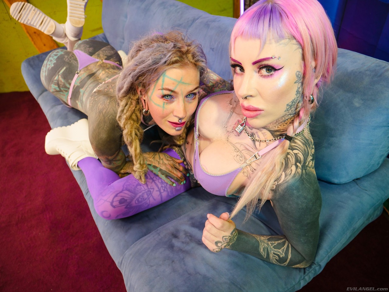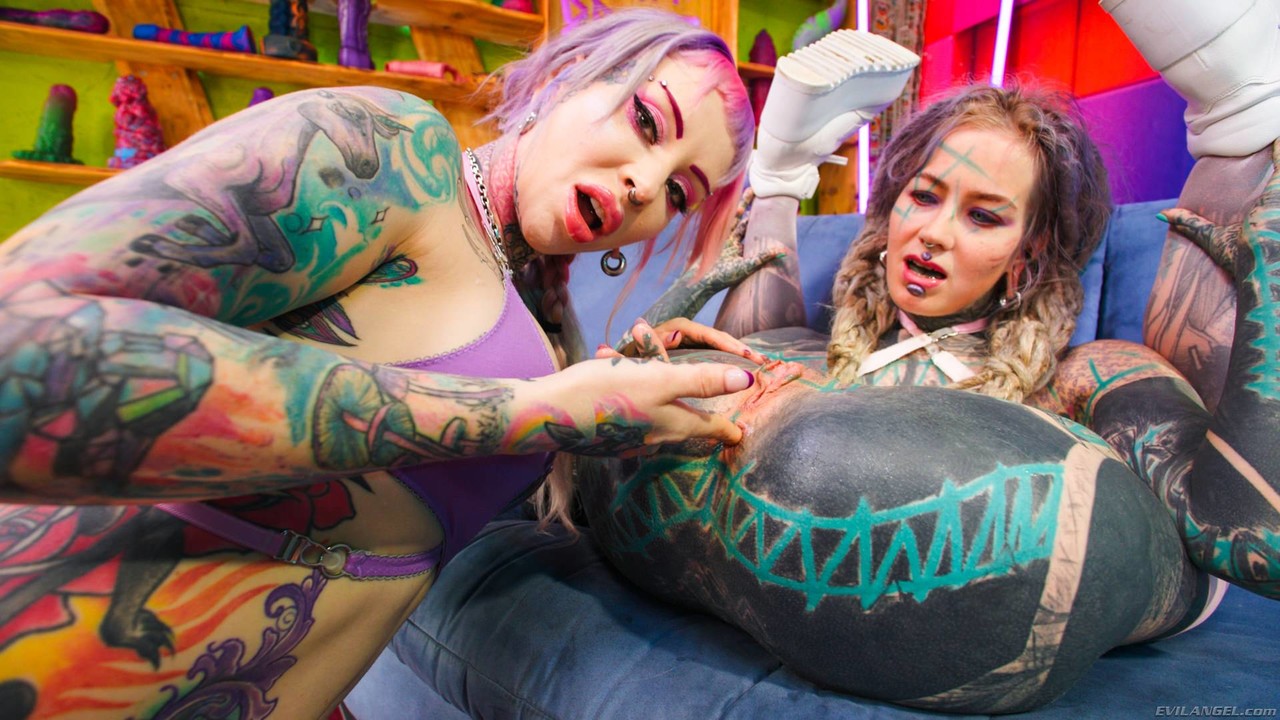 Evil Angel's inked sluts Anuskatzz and Kellie Panther feast on tight asses, trading anal dildo rides, pussy eating and stocking-clad scissor humping in raw lesbian gape pics.