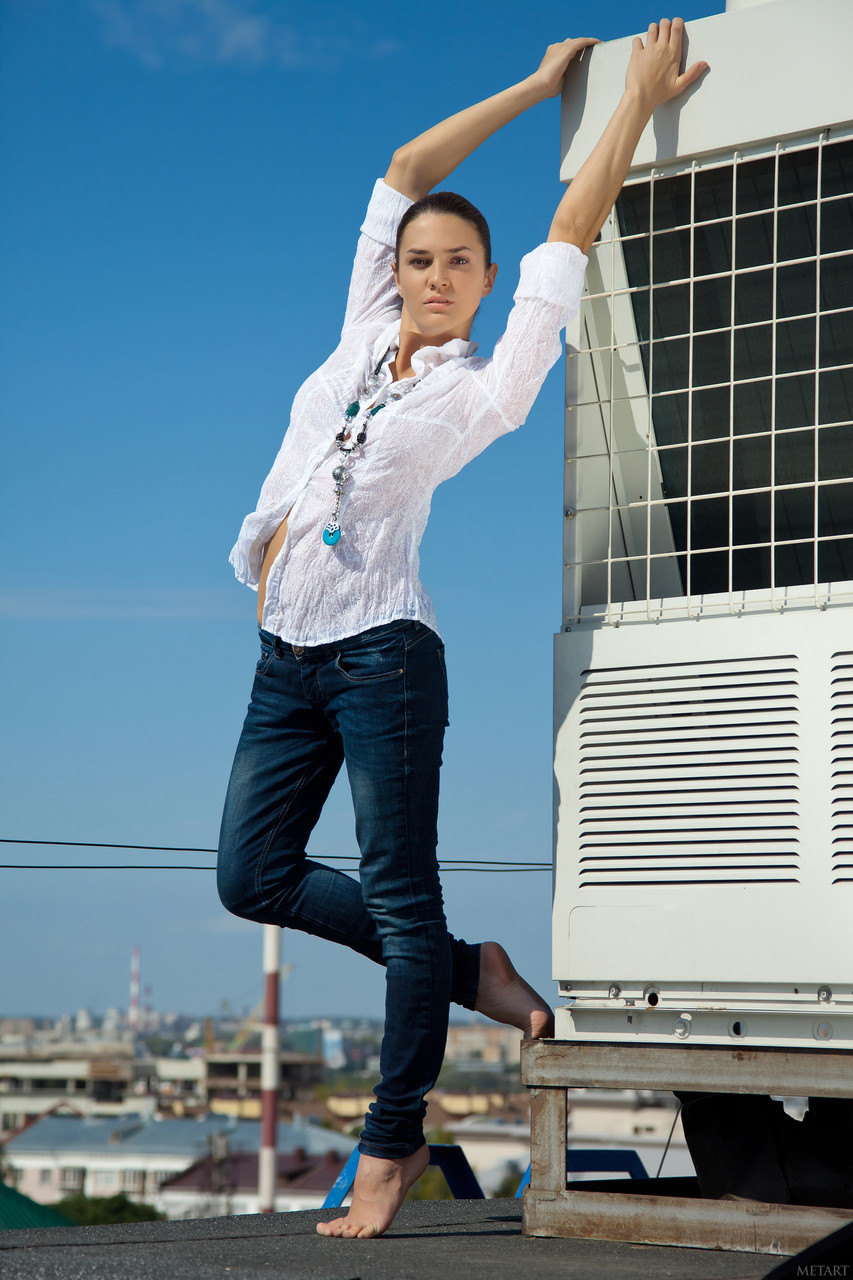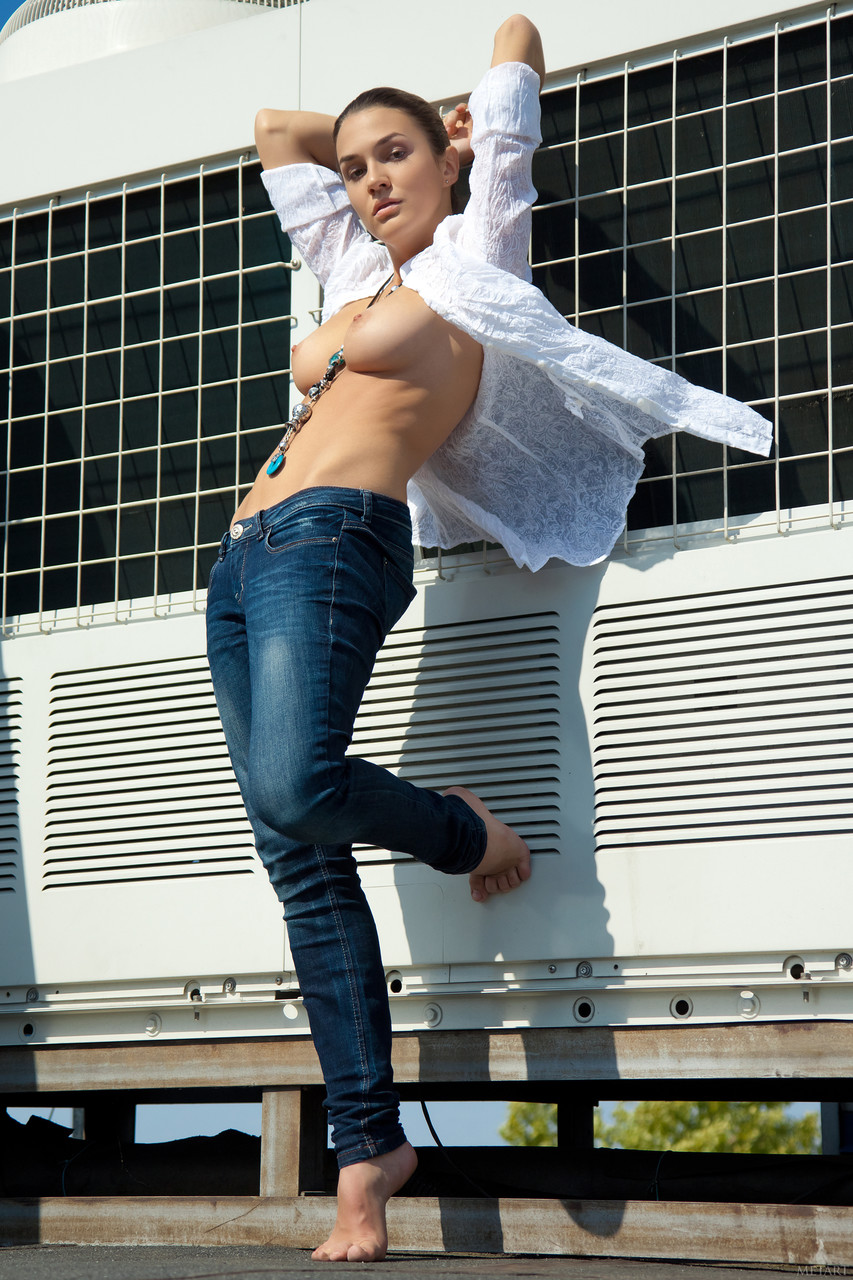 Tall, flat-chested teen Vanda B strips her jeans outdoors, flaunting bald pussy, tiny tits and perfect asshole in kinky glam nude Met Art gallery.