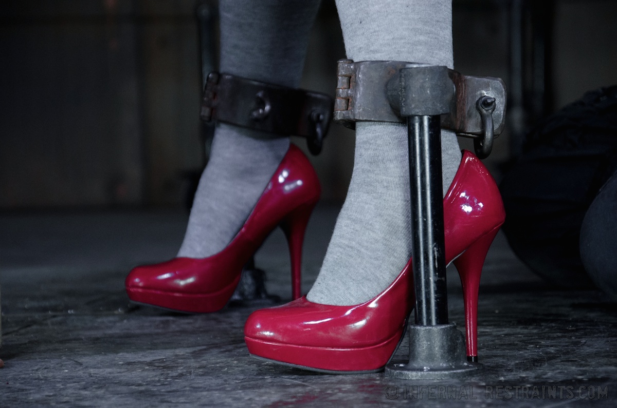Tattooed redhead Freya French endures sensory-deprivation bondage: blindfolded, sock-gagged, spanked, feet teased in thigh-highs—intimate BDSM close-ups.