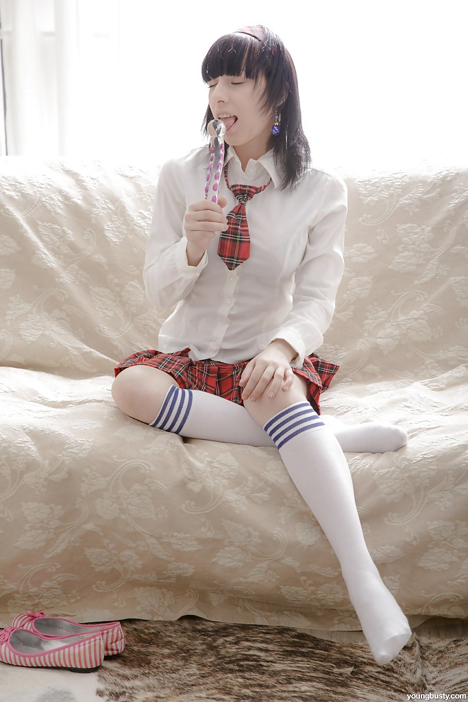 Brunette teen Serena C flaunts big tits in thigh-high socks, strips lingerie, spreads pink pussy and dildo-fucks to climax in solo sock-fetish gallery.