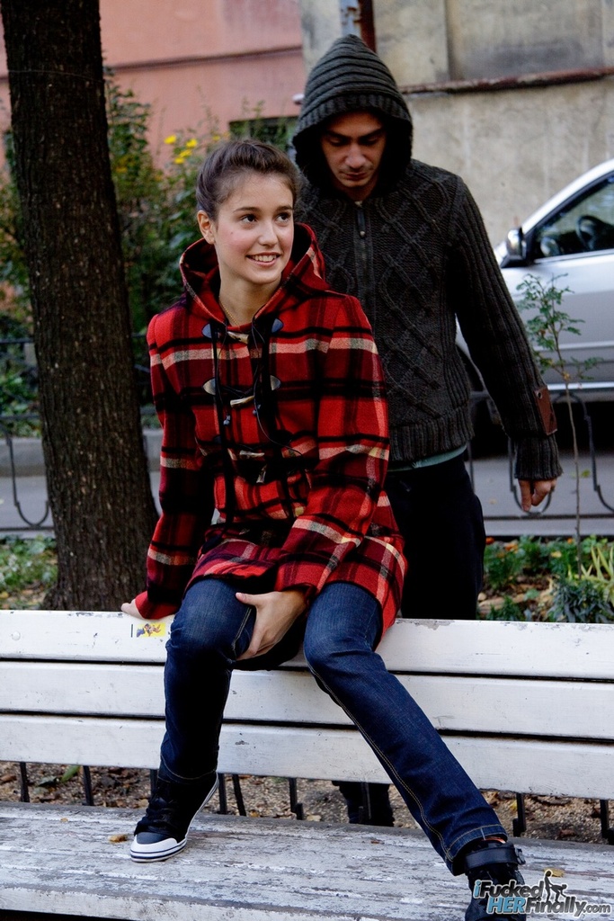 Super skinny brunette teen in knee-high socks gets her first-time anal and tight pussy pounded by huge cock outdoors, drops to knees for messy facial.