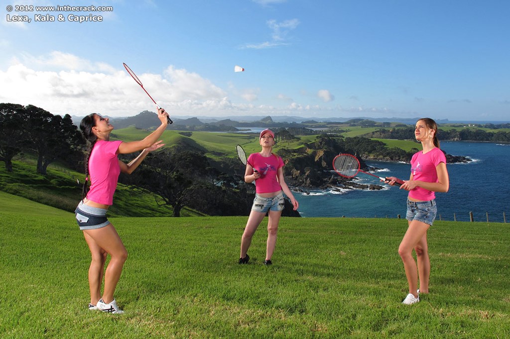 Three gorgeous MILFs flash perfect asses in tiny shorts during outdoor badminton, spreading pussy and asshole close-up in steamy lesbian threesome.