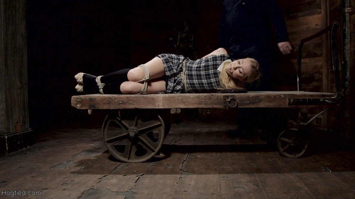 Hogtied blonde Emma Haize submits to Sgt Major in intense BDSM bondage, humiliation, tiny natural tits exposed, skirt lifted, dildo tease, tattooed slave girl punished in naked pics