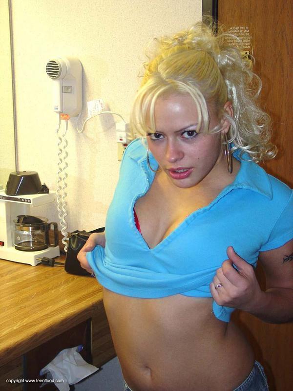 Curly blonde amateur Shay strips to lingerie on the bathroom counter, spreading legs to reveal pierced teen nipples and shaved vagina in her first-time nude spread.