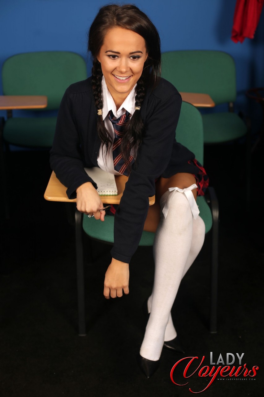 Naughty amateur schoolgirl Felicity Hill teases with upskirt flashes of her yellow panties under plaid skirt, pigtails swaying as she shows off tight uniform, stockings and innocent college girl charm for voyeur fans.