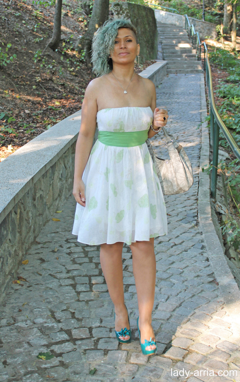Naughty Latina MILF Lady Arria flashes upskirt no panties outdoors, teasing shaved pussy under short skirt and high heels in amateur MILF action.
