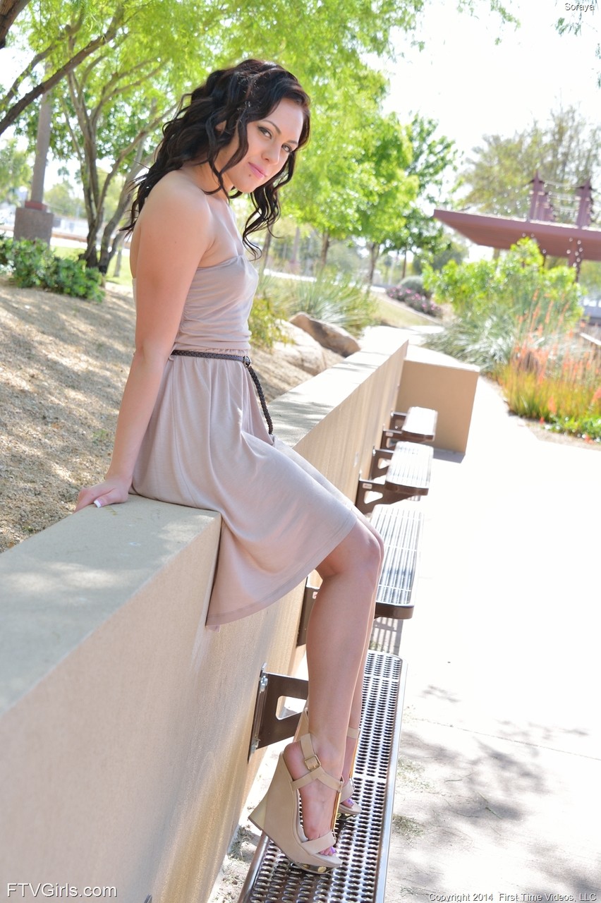 Soraya flashes perky pointy tits, long nipples & upskirt pussy outdoors, spreading big clit ass before public fingering—glamour amateur tease.