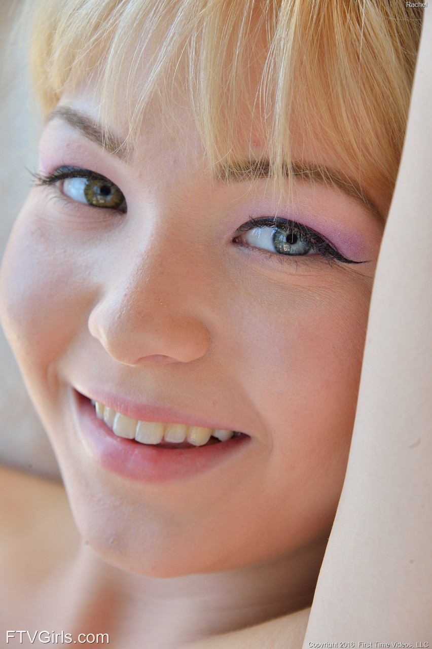 Blonde teen Rachel strips to reveal her big natural C-cup tits, cute face and tight ass, spreading in pigtails while toying her Indian teen pussy.