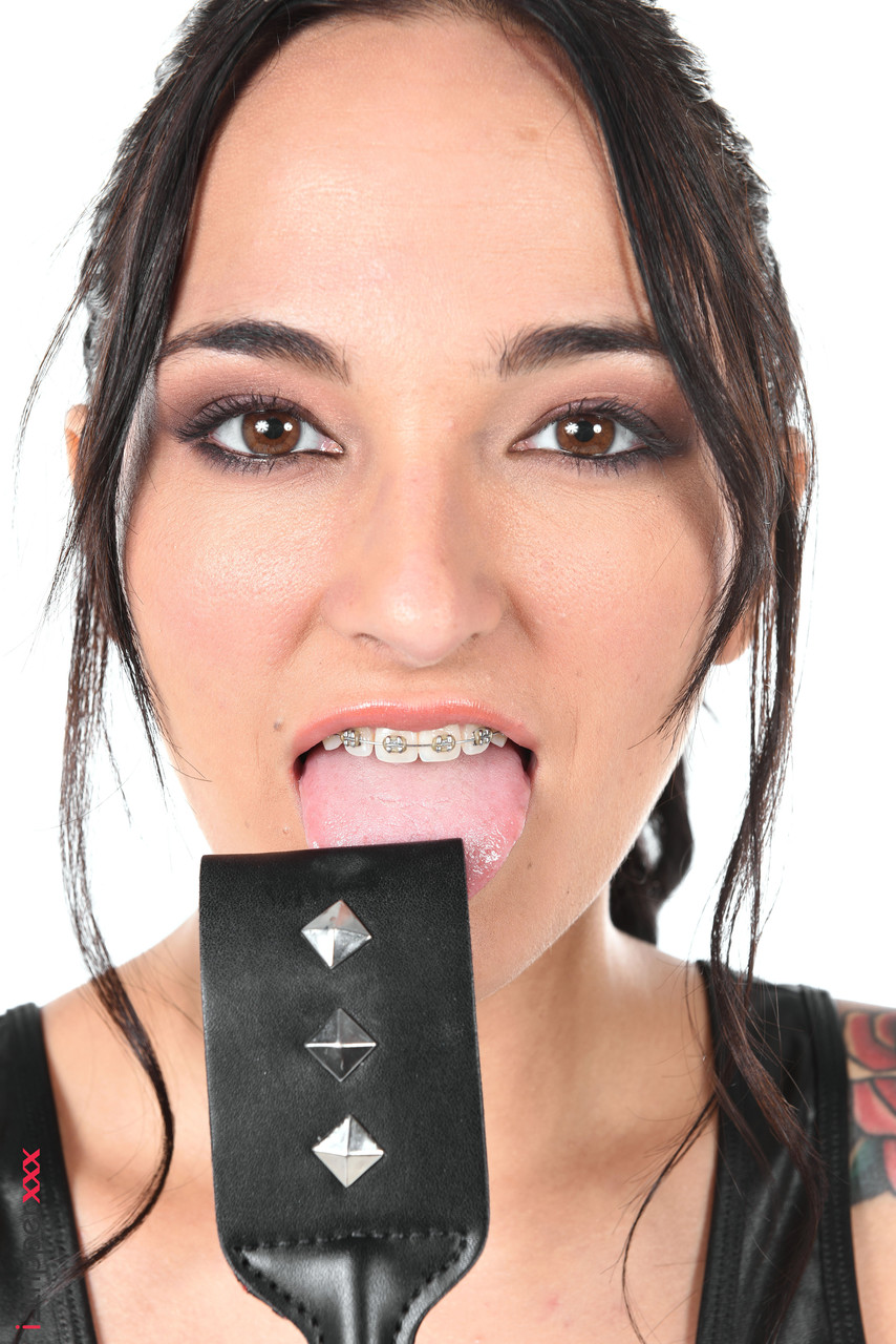 拉丁少女克劳迪娅·巴维尔脱下皮质连衣裙手持皮鞭 - 图片 1 / 15