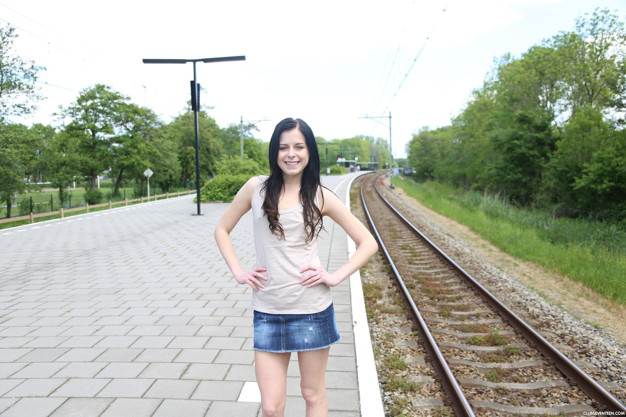 深色头发的少女展示她的乳房和阴道然后完全赤身裸体在公共场所