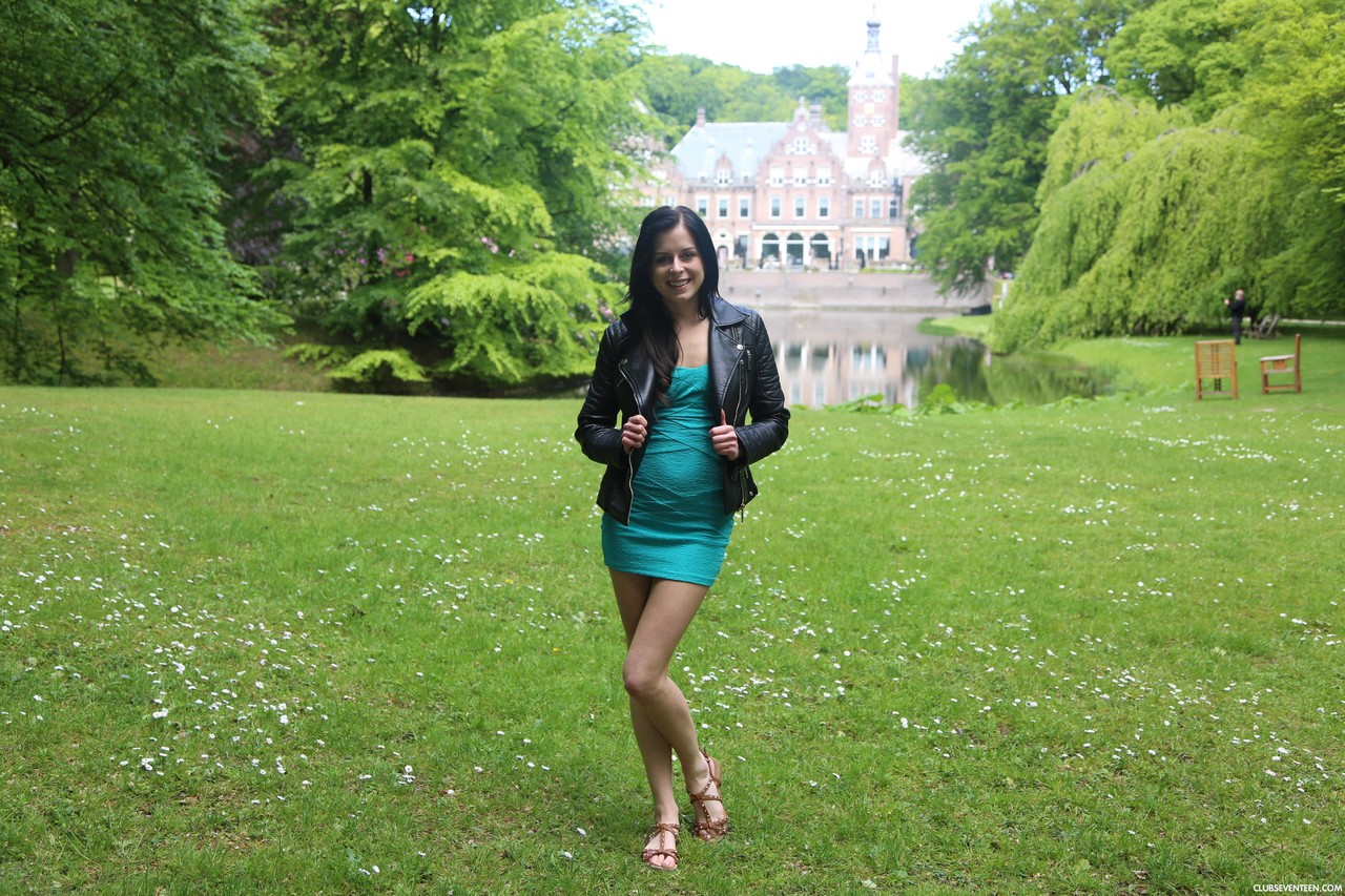 一位黑发的欧洲少女在短裙下露出小乳房和光滑的阴部,然后在公共公园里完全脱光衣服,张开长腿给人一种性感的视觉刺激。
