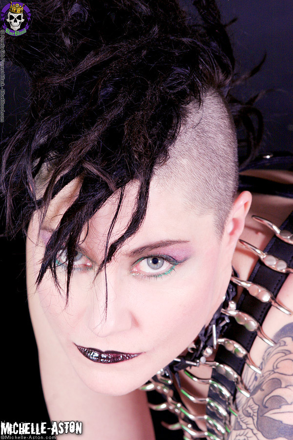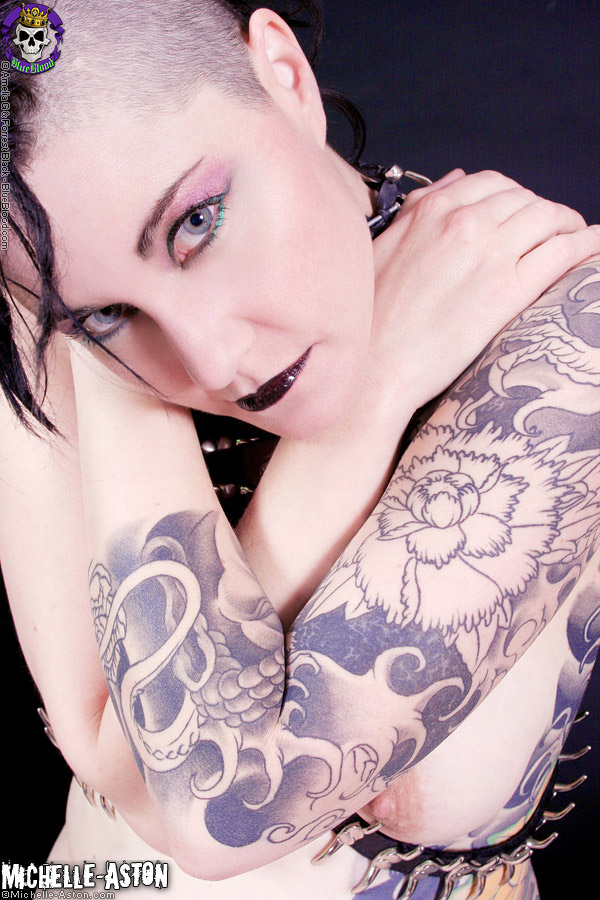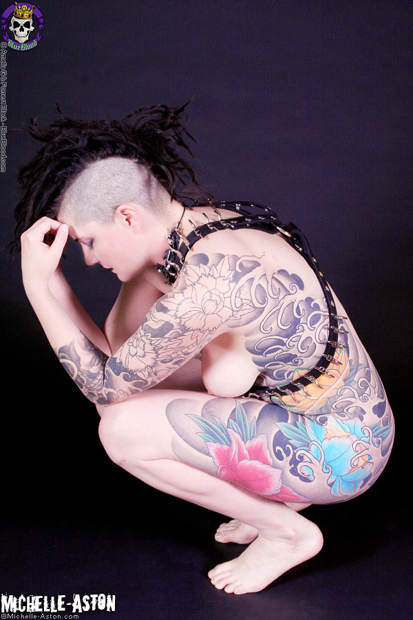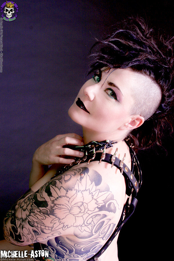 纹身的另类模特米歇尔·阿斯顿在皮革束腰上触摸自己的阴部 - 图片 5 / 15