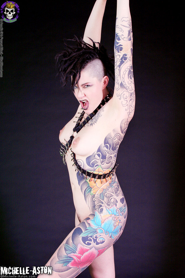 纹身的另类模特米歇尔·阿斯顿在皮革束腰上触摸自己的阴部