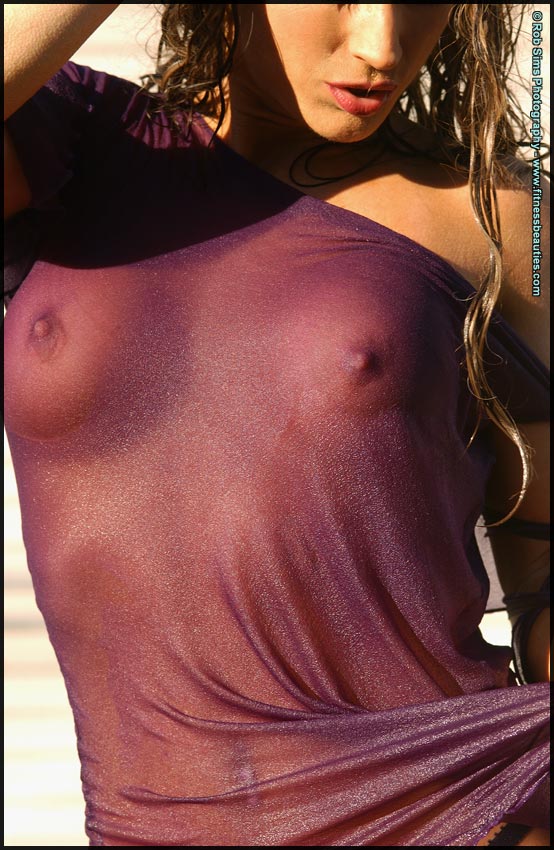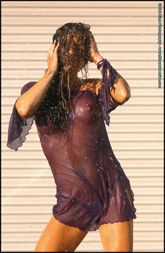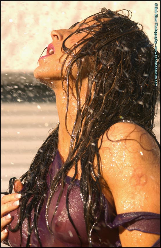 健身模特洛雷塔·林恩穿着内衣用花园水管把自己淋湿 - 图库信息
