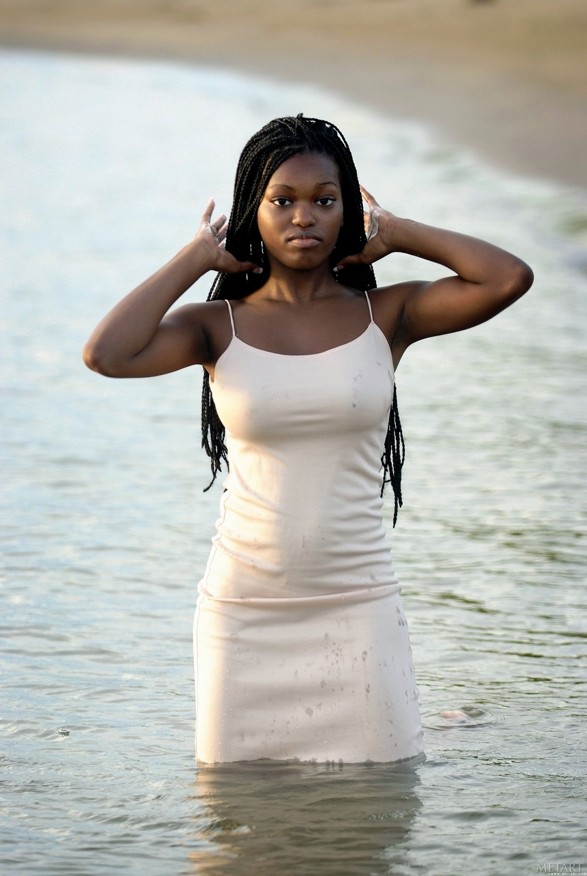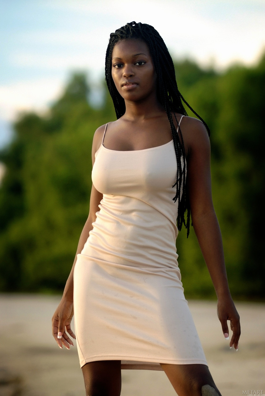非洲美女Deserea A在海滩上展示多汁美乳并摆姿势 - 图库信息