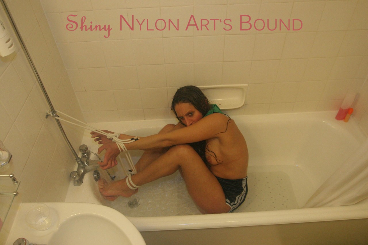 浴缸中的深色头发女性,双手和双脚被绑 - 图片 4 / 16