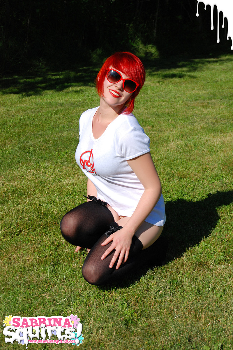 红发萨布丽娜户外喷潮展示剃毛蜜穴 - 图库信息