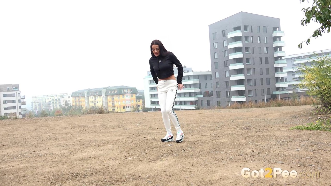 漂亮黑发麦迪·布莱克在开阔场地脱下裤子小便
