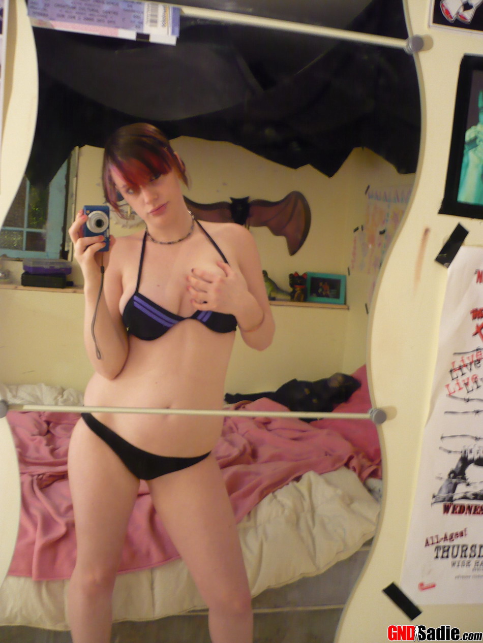 红发业余女郎在镜子前自拍时脱至比基尼