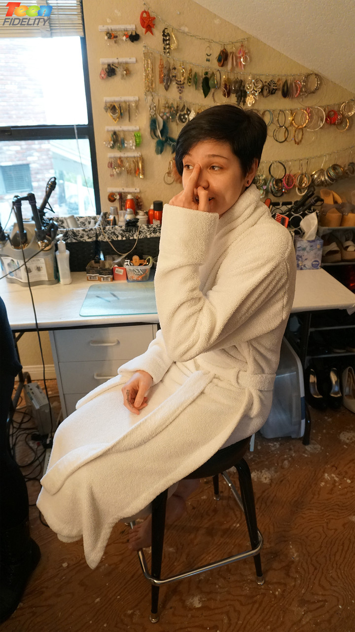 Cadey Mercury,短发的青少年黑发女郎,脱掉牛仔裤,展示她超级苗条的身材,微小的自然乳房和僵硬的乳头,在一个蒸汽的个人脱衣秀中。