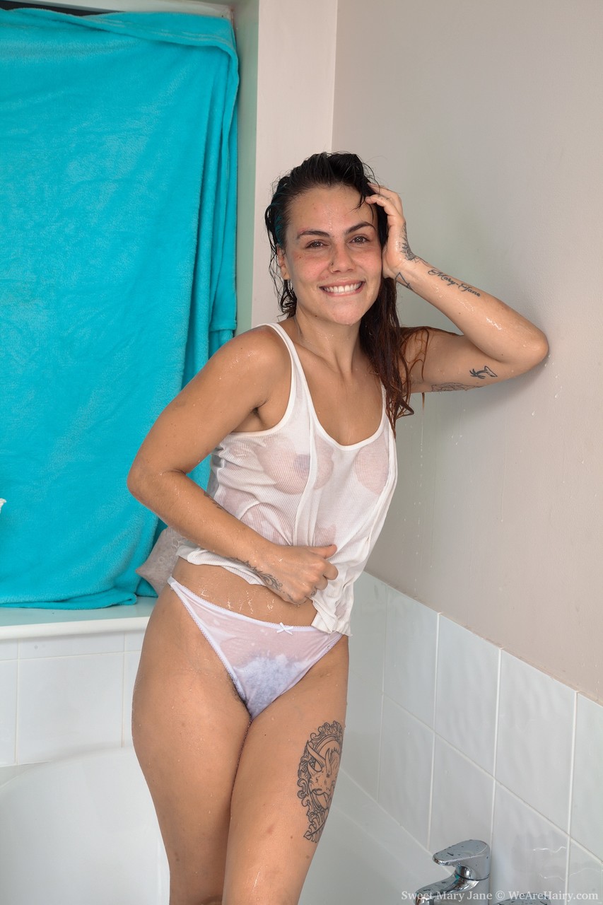 甜美的业余PAWG Sweet Mary Jane 炫耀她湿漉漉的阴毛和内裤里的翘臀,弯腰展示她的纹身之美。