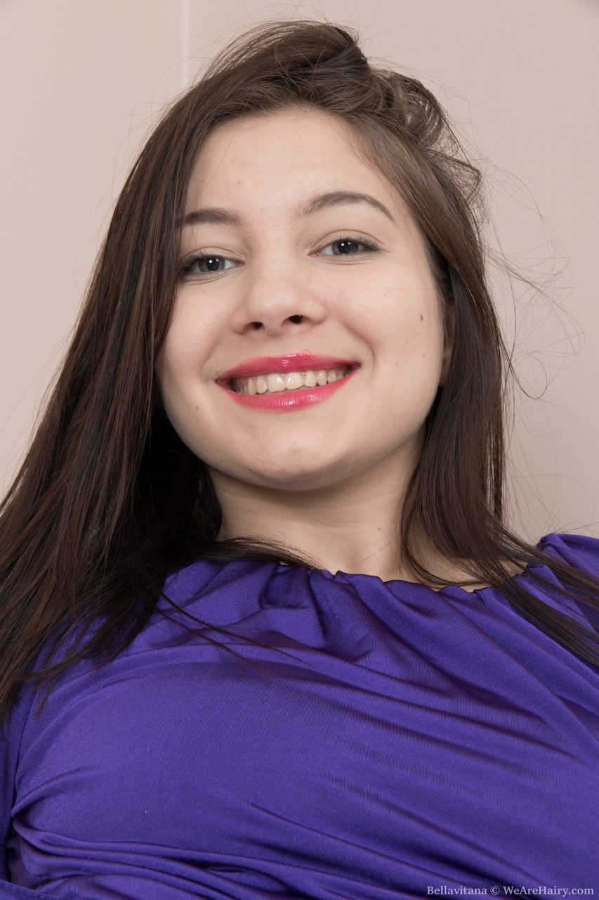 开朗的棕发女郎贝拉维塔娜展示她多毛的阴户和屁眼