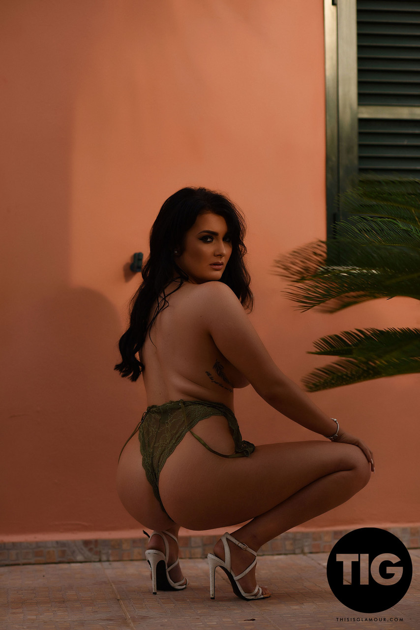 英国魅力少女阿什利·吉在外抛弃透明紧身衣,炫耀巨大的自然乳房,穿着高跟鞋和透明内衣,为性感的单人挑逗做准备。
