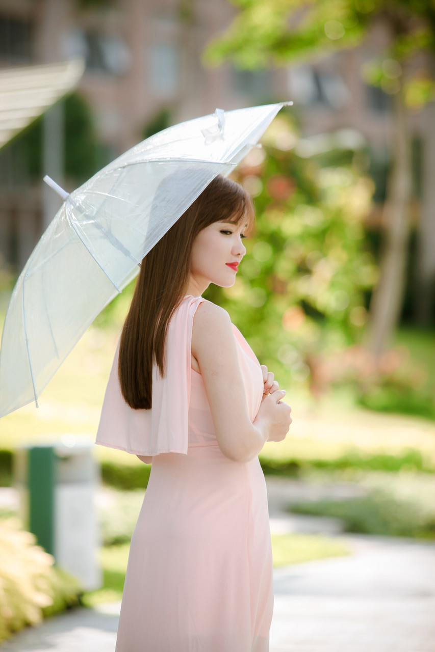 性感亚洲模特在公共场合穿着优雅连衣裙摆姿势 - 图库信息