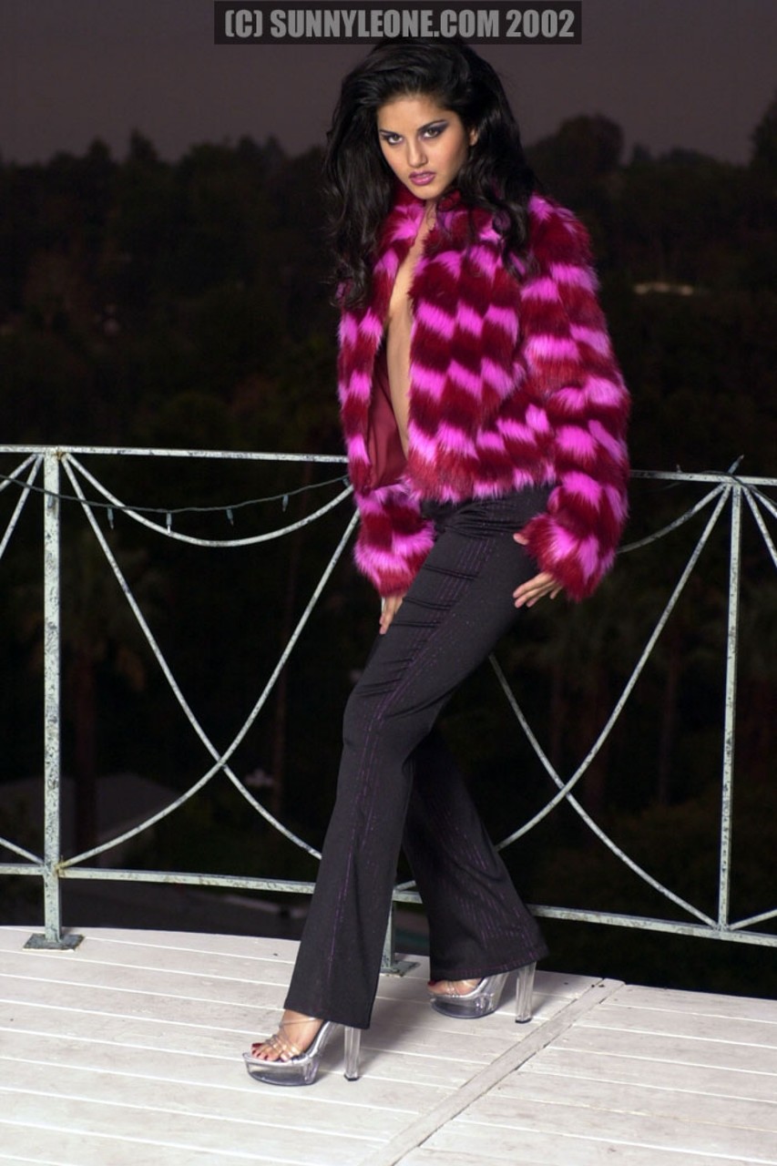 魅力印度色情明星Sunny Leone穿毛皮夹克和黑裤摆姿势