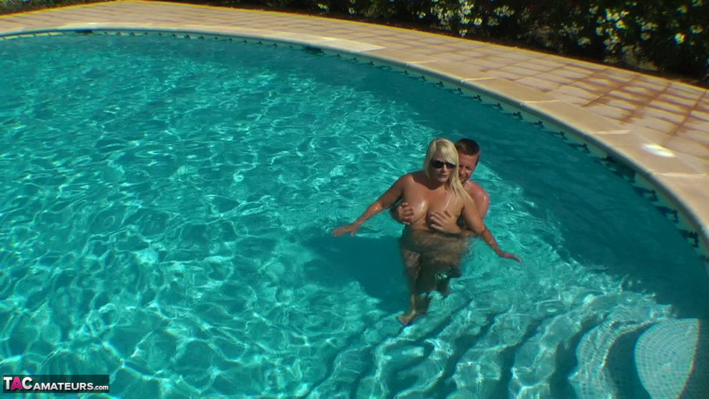 金发性感熟女Sweet Susi在泳池旁被猛烈操逼,巨大的天然乳房随着节奏上下摆动,她在阳光下接受深深的内射,整个过程都戴着墨镜。