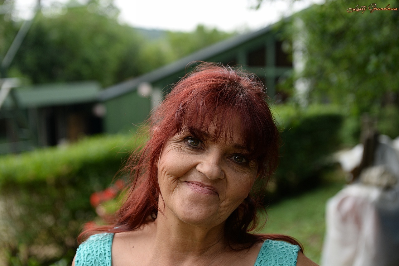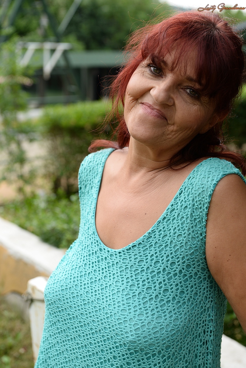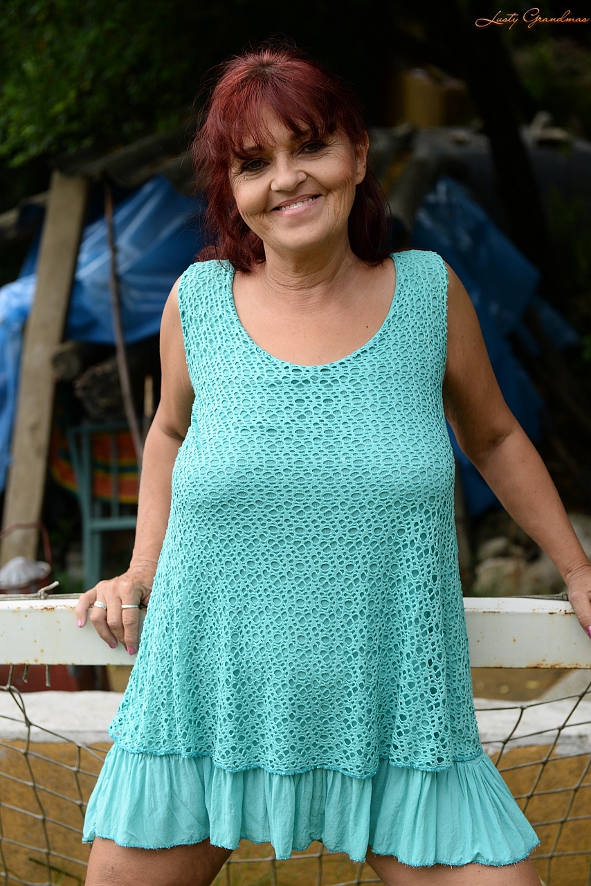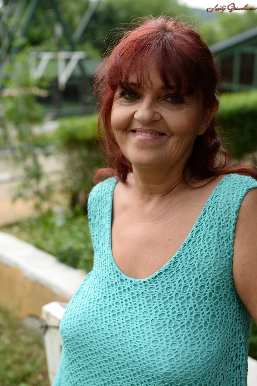 红发奶奶Livia掀起蓝色连衣裙露出丰满天然乳房 - 图库信息