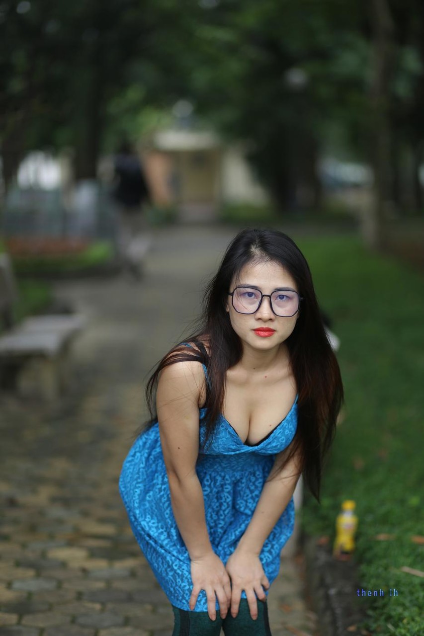 美丽的亚洲模特Elena在公共场合穿着可爱的蓝色连衣裙摆姿势 - 图库信息