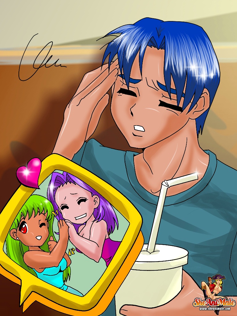 Busty cartoon shemales team up for a wild threesome with a blue-haired stud in this steamy animated encounter. Watch these voluptuous trans beauties share every inch in hardcore toon action.