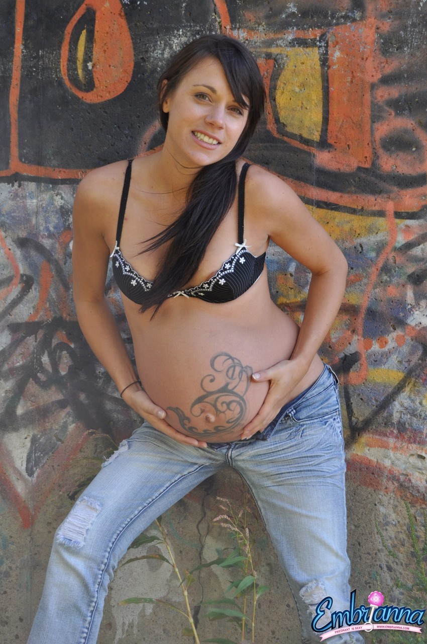观看怀孕少女Brianna在户外大胆脱衣和公开露点中炫耀她的香蕉形奶子、孕肚和纹身,穿着褪色牛仔裤。