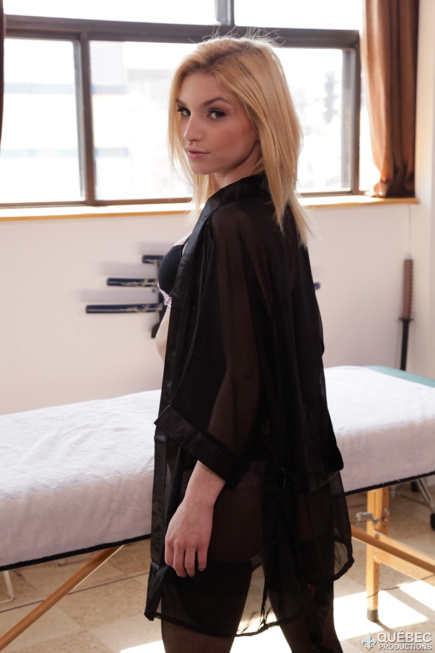 可爱苗条的金发少女 Nikita Teen 穿着黑色连衣裙和性感内衣 - 图库信息