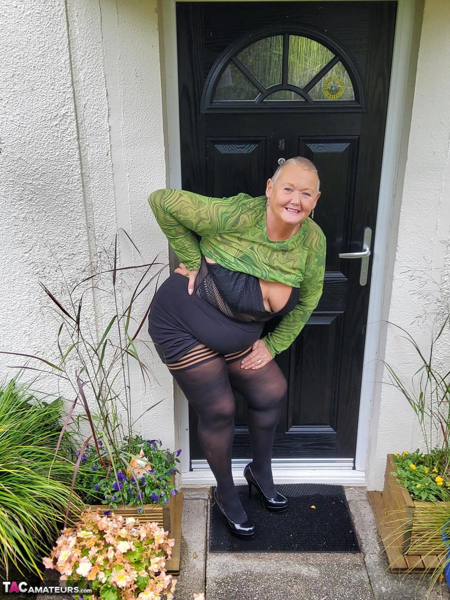 短发的丰满奶奶在丝袜中挑逗,露出内裤的上滑镜头。 BBW 业余爱好者张开,展示厚实的大腿和成熟的魅力。