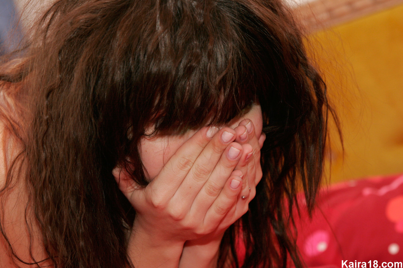 娇小少女Kaira 18在露出小胸部后遮住她的赤裸下体