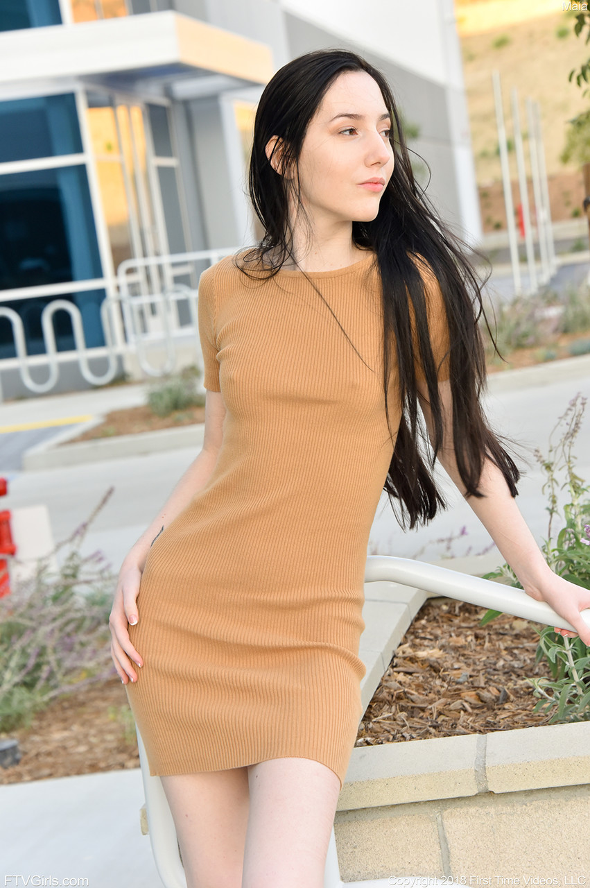 娇小的棕发女郎Maia在户外展示她微小的乳房和修剪过的阴道,在大胆的公共场合中展现她完美的少女身材,身穿牛仔裤。