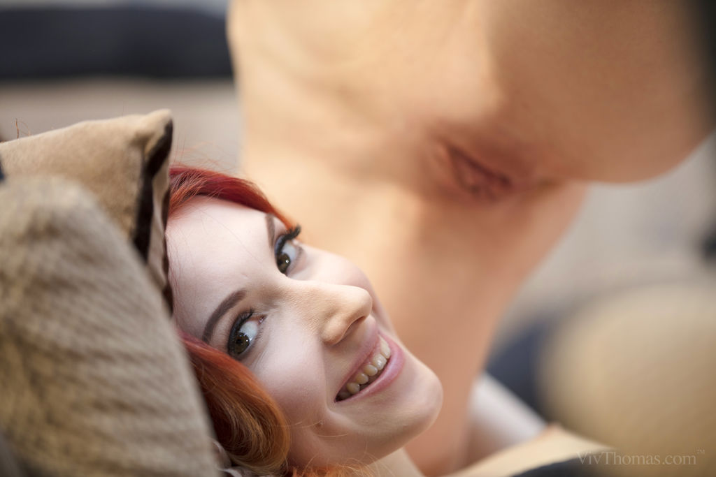 年轻的红发女同性恋者Elin Flame和Ivy Rein在沙发上亲吻并舔舐剃光的阴部,在热烈的青少年女女性爱中展示特写张开