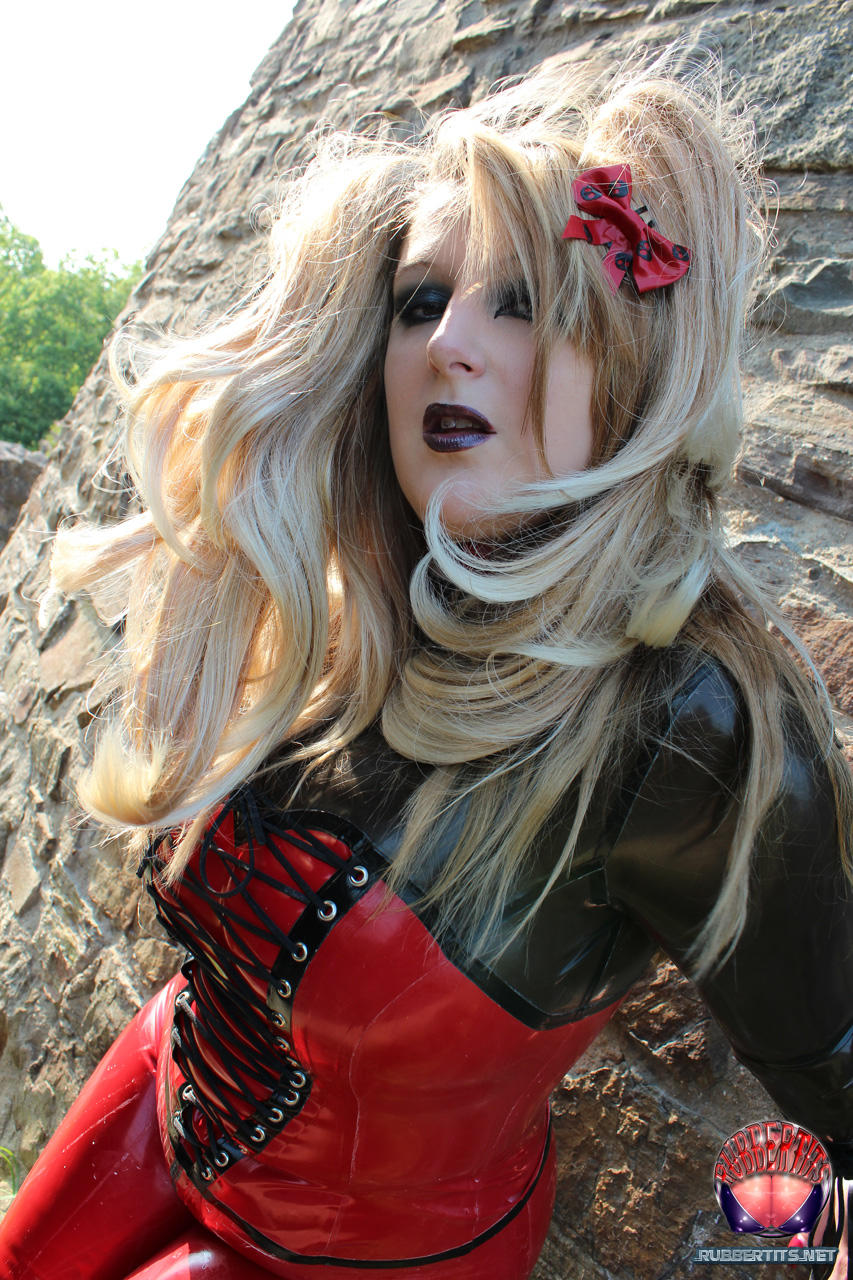 金发女模特穿乳胶服装和靴子 在城堡废墟外非裸体 - 图片 2 / 16