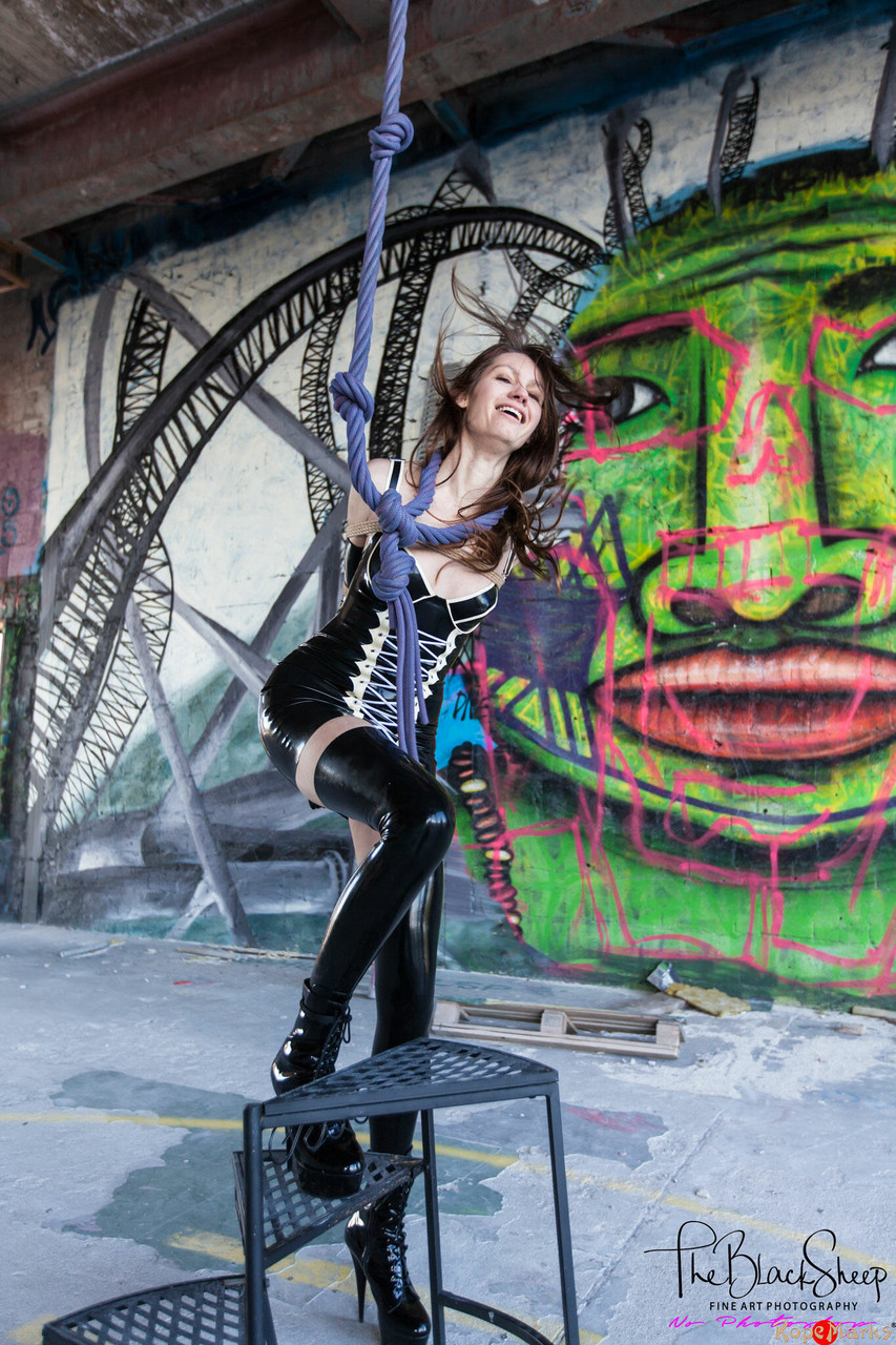 身穿乳胶衣的模特双臂被绑在身后进行束缚。穿着紧身乳胶裙、靴子高跟鞋的非裸PAWG服从BDSM束缚。非裸体恋物画廊。