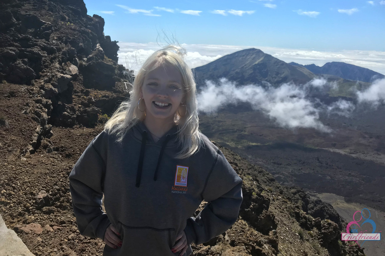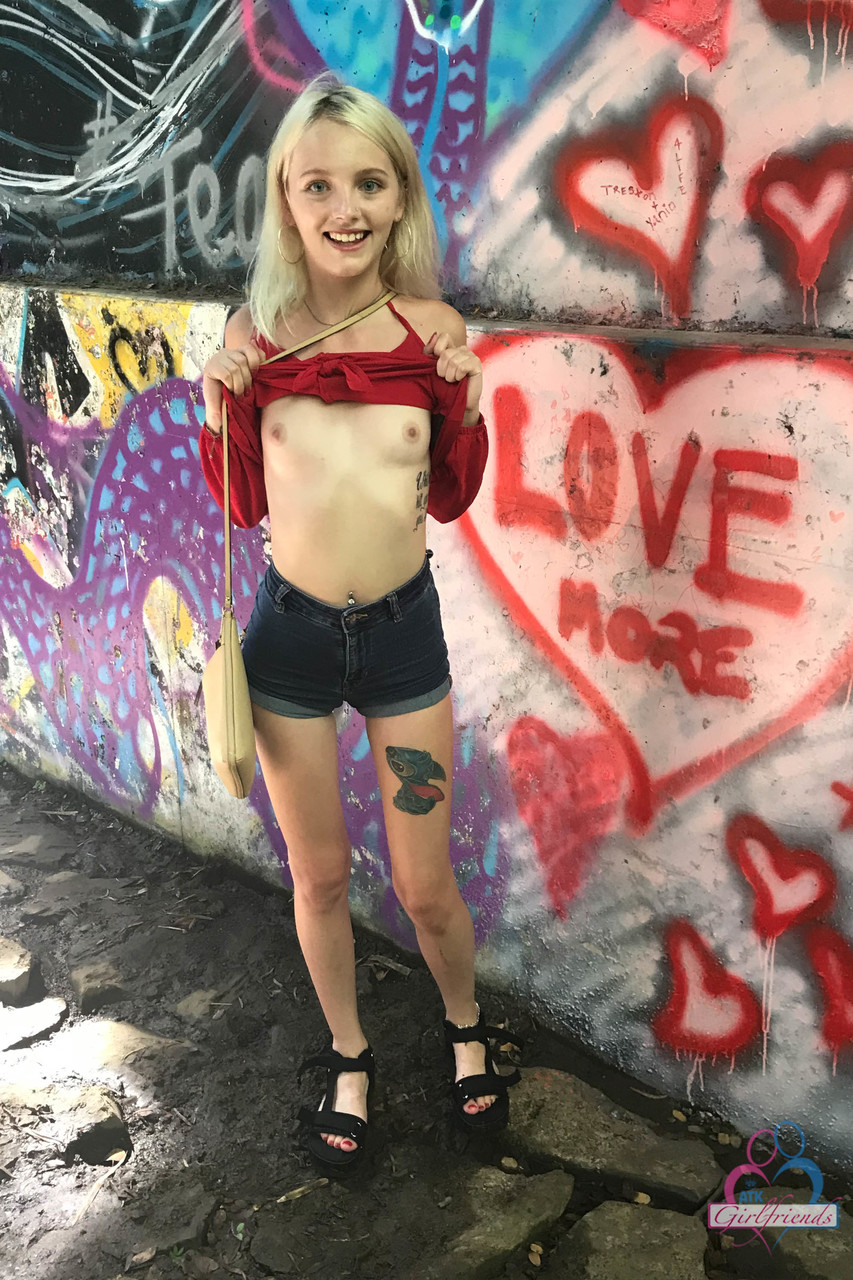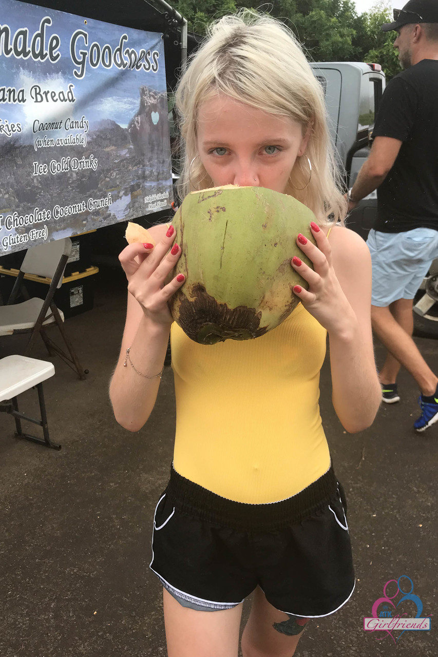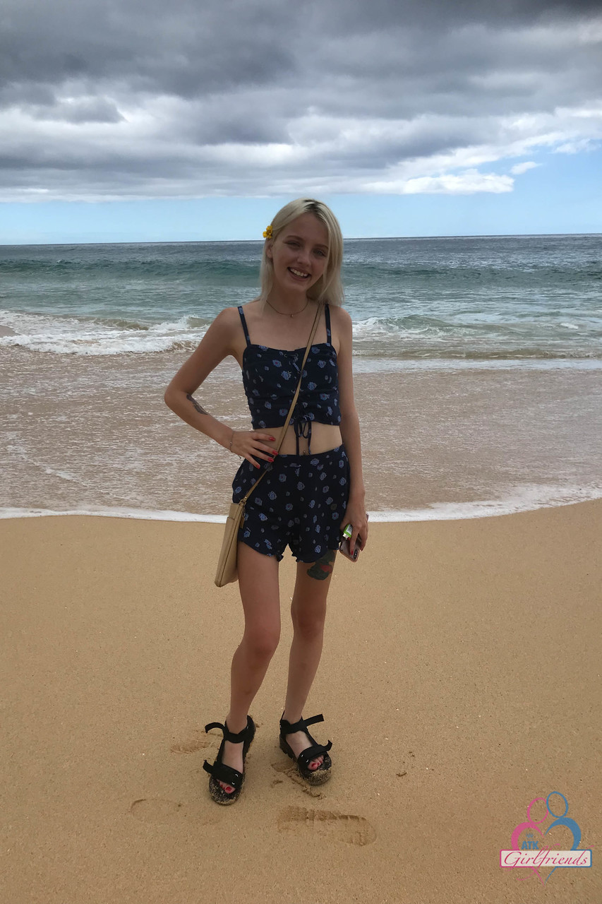 Petite blonde amateur Kate Bloom flashes her tiny tits and puffy pussy in public vacation spots, skinny nudist spreading feet and bikini twat all over town.