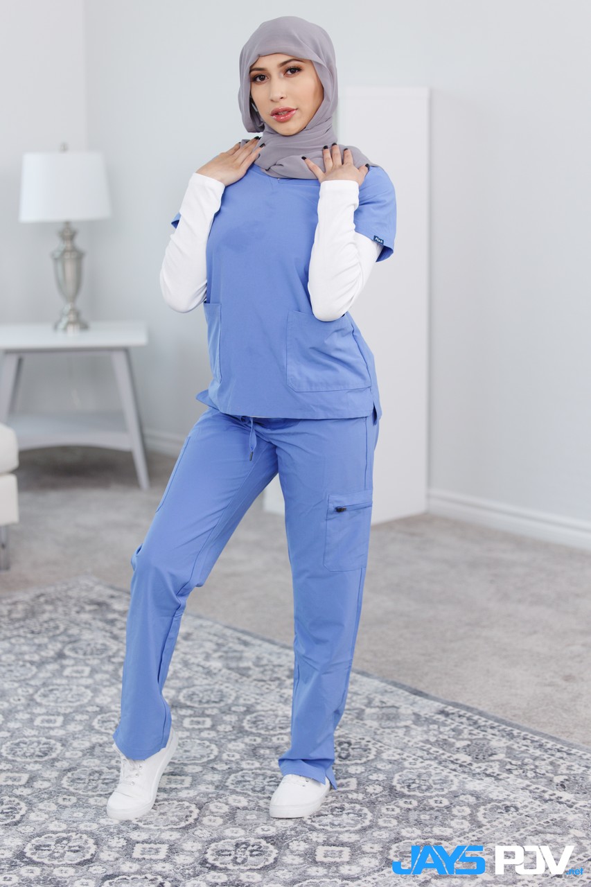 戴头巾的拉丁护士Penelope Woods用她剃干净的大阴部和惊人臀部挑逗,穿着紧身制服弯腰分开展示。